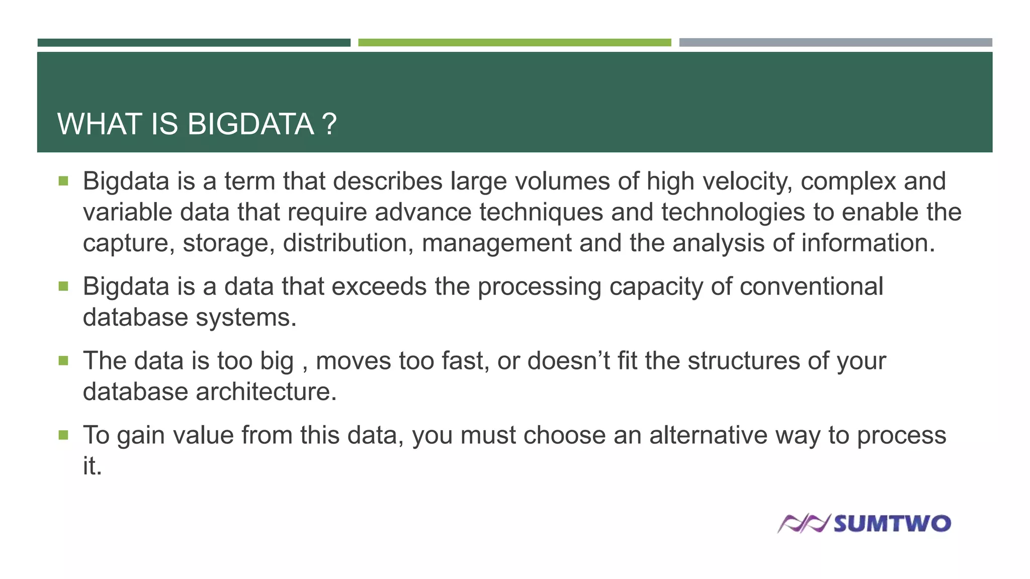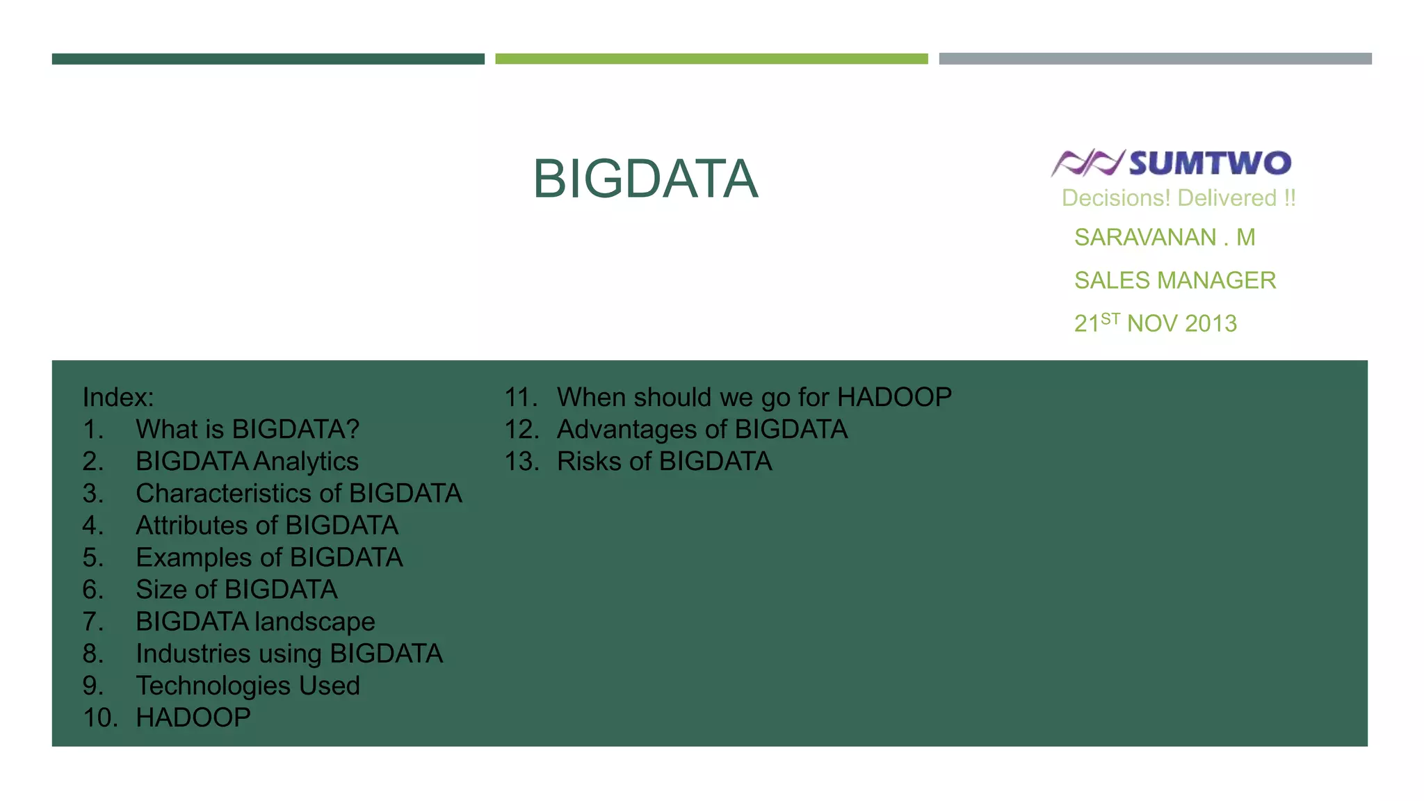 The document discusses big data, defining it as large volumes of complex data that require advanced technologies for processing and analysis. It highlights the characteristics, attributes, and industries utilizing big data, as well as technologies like Hadoop that facilitate big data processing. Additionally, it outlines the advantages and risks associated with big data, emphasizing the importance of proper management and analysis for effective decision-making.