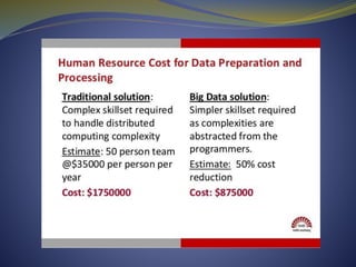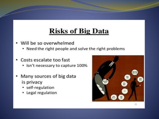 The document discusses big data, analytics, and their applications. It defines big data as large, complex datasets that are difficult to manage with traditional databases. Big data is characterized by its volume, velocity, and variety. Examples are given of how retailers, telecom companies, and e-retailers use big data analytics to gain insights. The document also outlines approaches to analytic development and discusses how various organizations use big data analytics in practice.