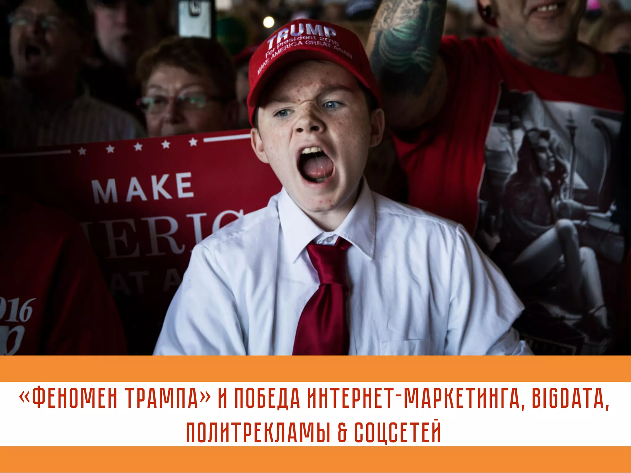 Документ представляет собой презентацию о влиянии интернет-маркетинга, больших данных и социальных сетей на выборы в США 2016 года, в частности, на победу Дональда Трампа. В нем рассматриваются стратегии политической рекламы, использование хештегов, а также сравнительные бюджеты рекламных кампаний Трампа и Хиллари Клинтон. Презентация создана для обсуждения на бизнес-завтраке и включает факты, примеры кейсов и рекомендации по интернет-маркетингу в политических кампаниях.