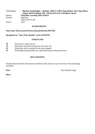 Ravi Prakash Singh is a highly motivated individual seeking opportunities in big data, Hadoop, and machine learning, with a B.Tech in Information Technology and relevant experience in data processing and analysis. He has hands-on expertise with various big data technologies and has undertaken projects related to offline retail wallet analysis and machine learning using Apache Spark. His strengths include dedication, teamwork, and a commitment to continuous learning.