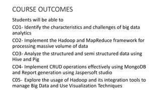 This document provides an overview of a course on fundamentals of big data. It outlines 5 course outcomes related to identifying big data characteristics, implementing Hadoop and MapReduce, analyzing structured and semi-structured data using Hive and Pig, using MongoDB for CRUD operations, and exploring visualization techniques. It also describes 2 course units, the first of which covers characteristics of big data like volume, velocity, and variety, as well as challenges. Traditional business intelligence is contrasted with big data approaches.