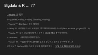 - Variety ?? - 다양한 데이터 = 계량화, 구조화하기 어려운 데이터(SNS, Youtube, google 서칭…?)