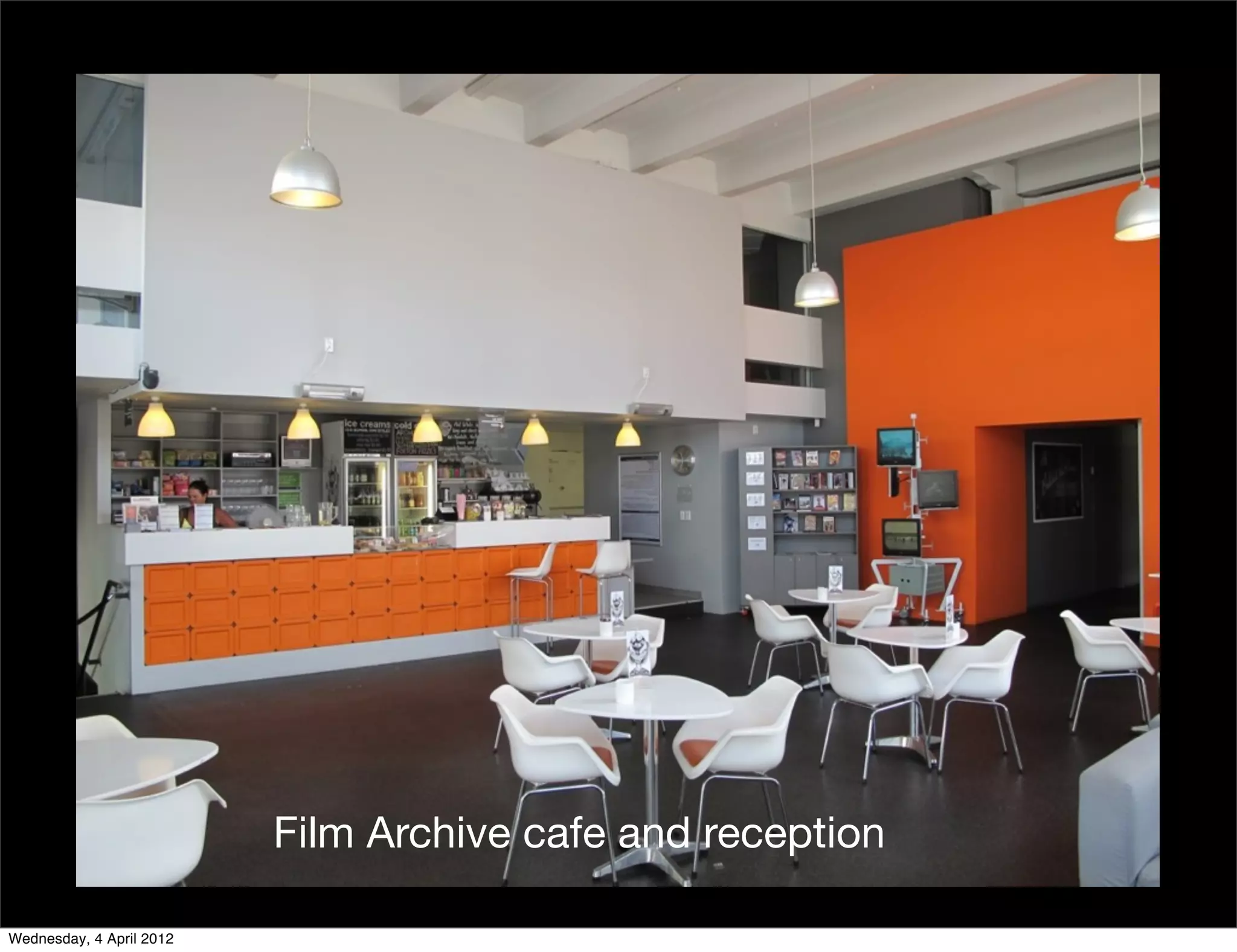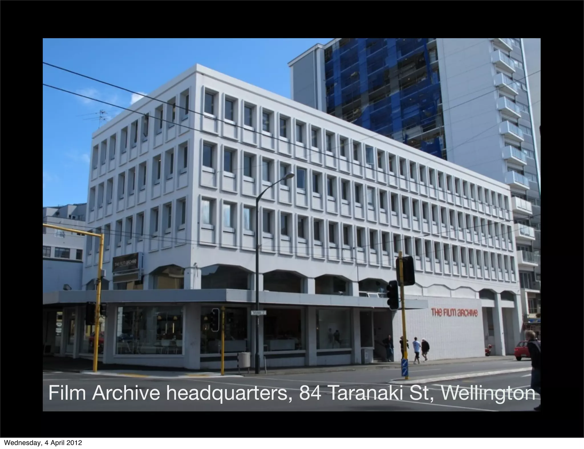 The New Zealand Film Archive collects, preserves, and provides access to over 120,000 film and video titles and 300,000 items. It has over 40 staff members. The Archive stores films at facilities in Wellington and Plimmerton and uses technologies like digitization and data storage on tape and hard drives to preserve and provide access to its collection. Risks to the collection include physical dangers, technological obsolescence, data integrity issues, and over-reliance on single systems or formats. The Archive aims to balance preserving everything with maintaining quality.