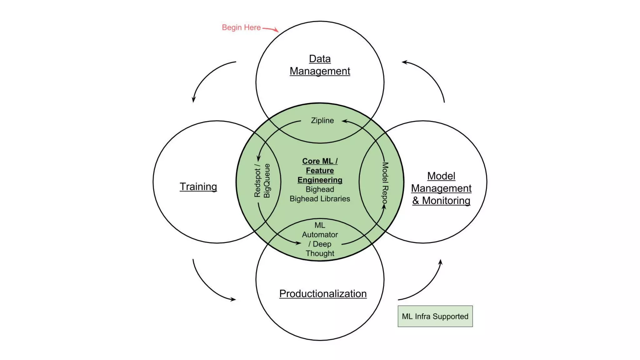 It provides shared services and tools for data management, model training/inference, and model management to make the ML process more efficient and production-ready. This includes services like Zipline for feature storage, Redspot for notebook environments, Deep Thought for online inference, and the Bighead UI for model monitoring.