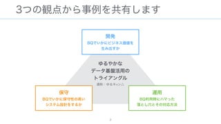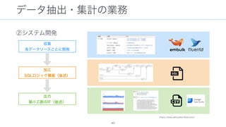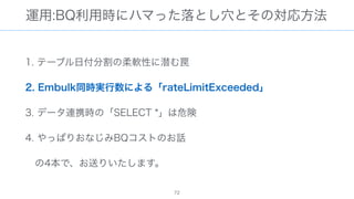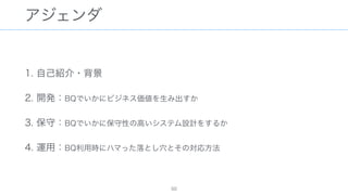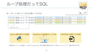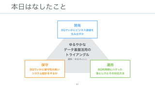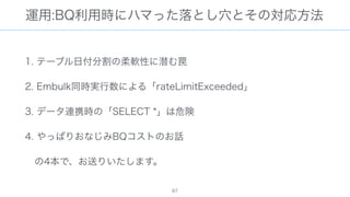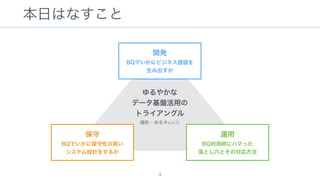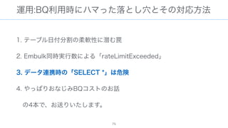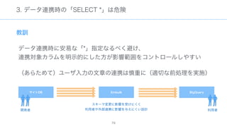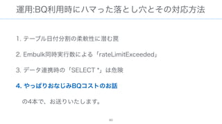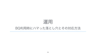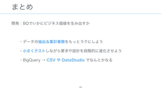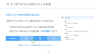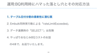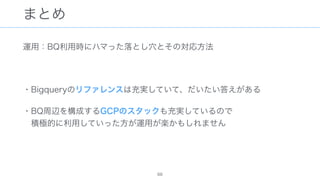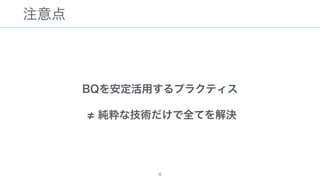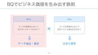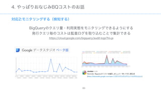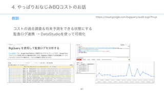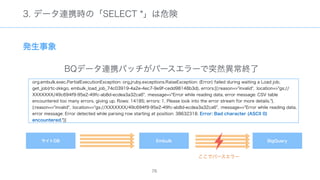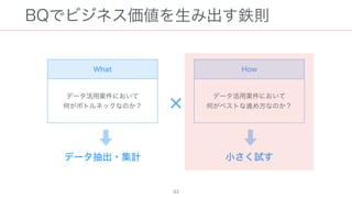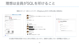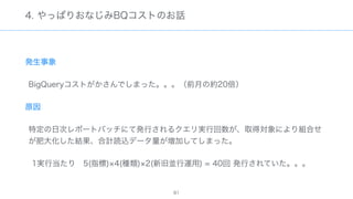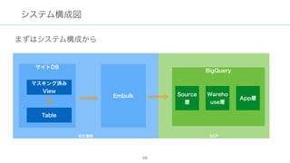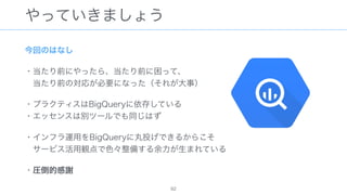 The document discusses data warehousing using BigQuery on Google Cloud Platform. It includes sample SQL queries to select, transform, and load data from a source database into BigQuery tables. Specific tasks mentioned include masking email addresses, casting a string field to an integer, and handling null values.