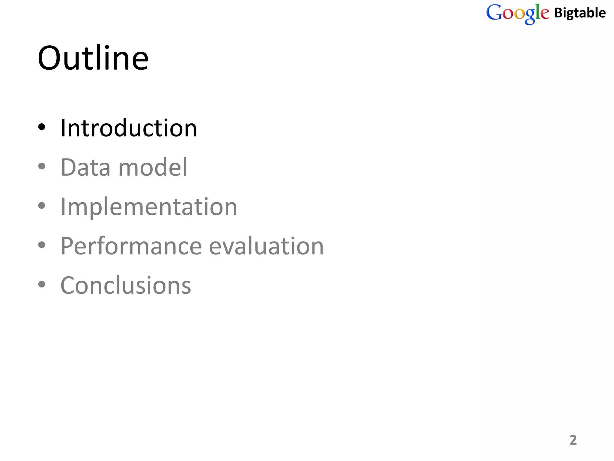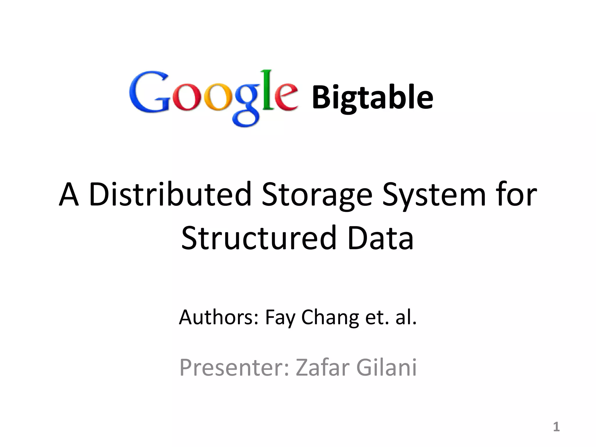 Bigtable is a distributed storage system for managing large structured datasets. It uses a sparse distributed multidimensional sorted map as its data model. Bigtable has been widely adopted by Google for applications requiring scalability, high performance, and high availability, serving over 60 Google products. It utilizes various technologies like the Google File System for storage and Chubby for coordination.