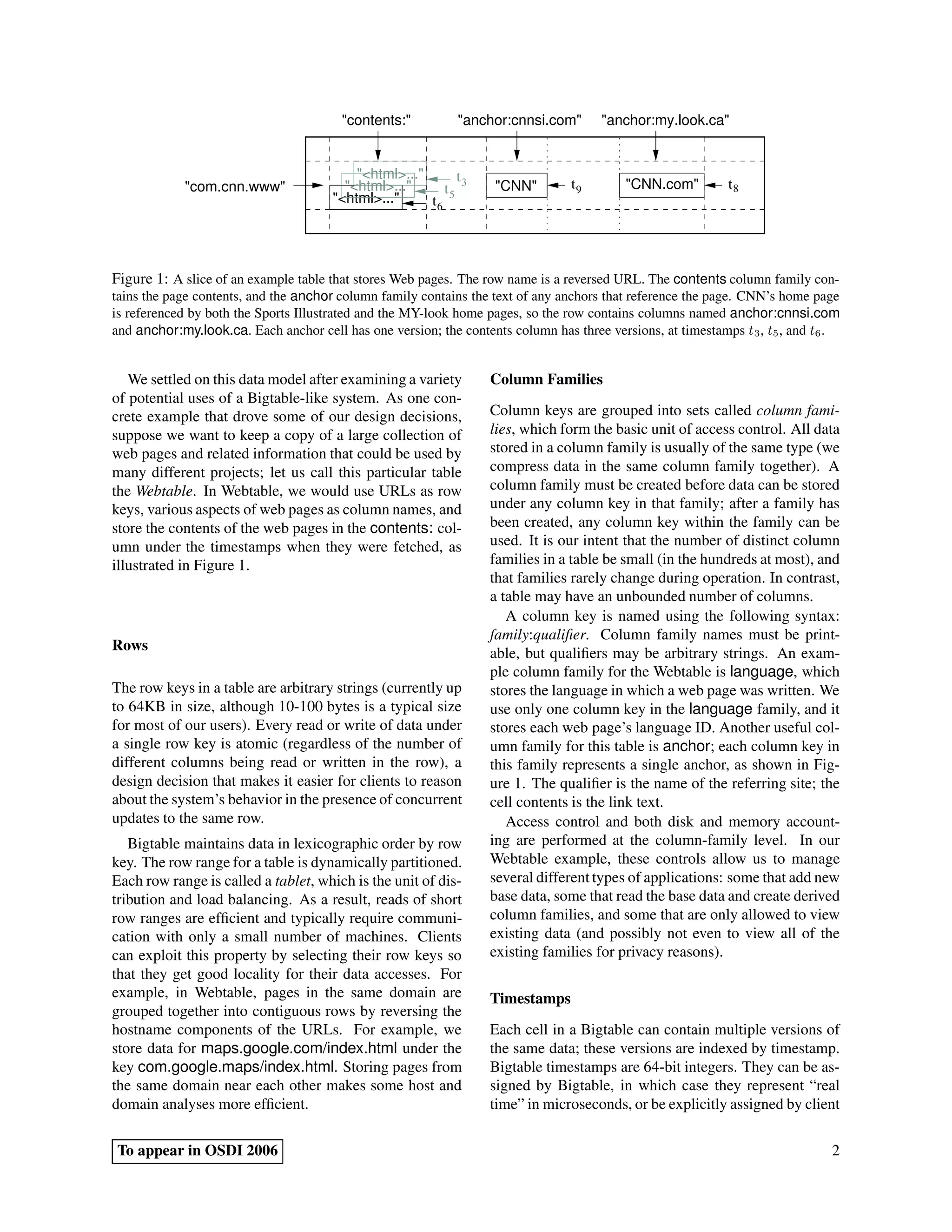 Bigtable is a distributed storage system designed to scale to petabytes of data across thousands of servers. It provides a flexible data model with dynamic control over data layout and format, allowing clients to store and query structured and unstructured data. Data is indexed and queried using row keys and column qualifiers, and versions are indexed by timestamp. The system achieves high performance and scalability through its use of distributed storage on Google infrastructure and a tablet-based data partitioning scheme.