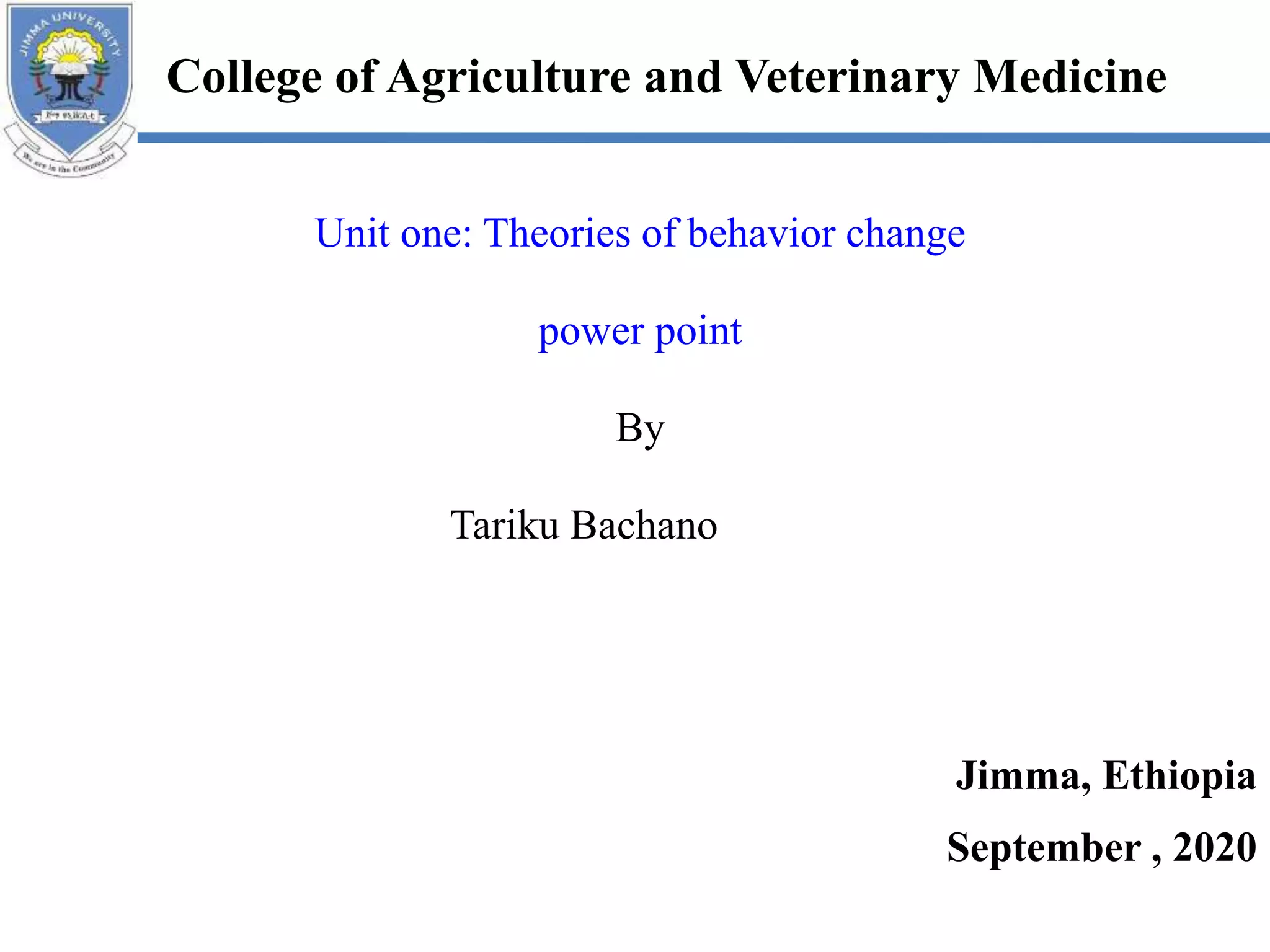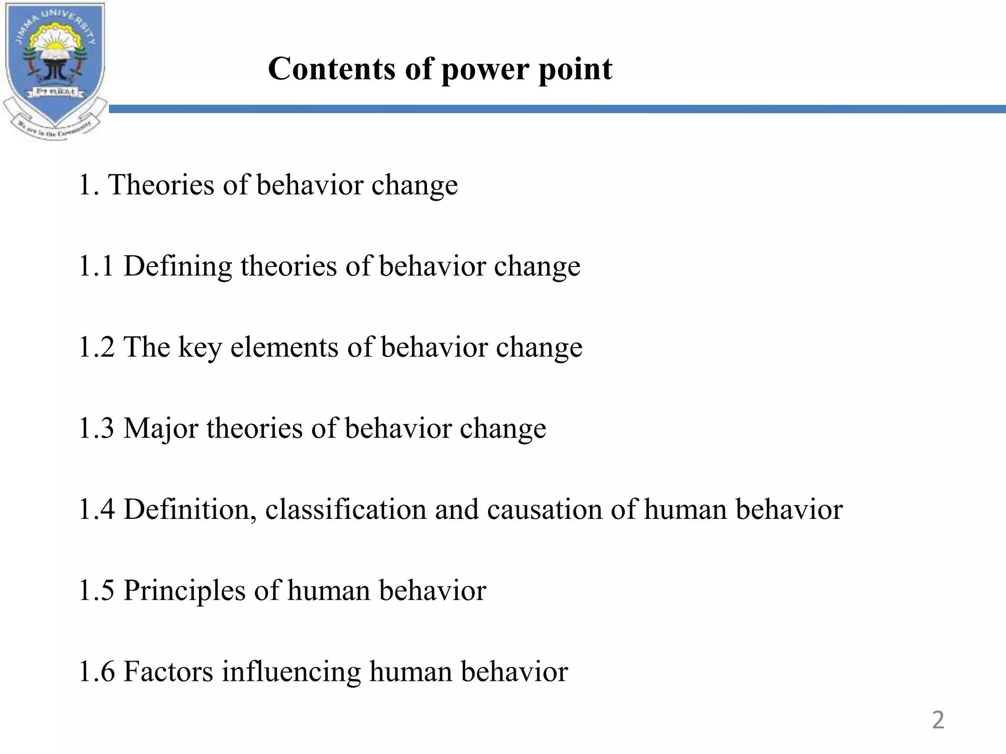 This document provides an overview of theories of behavior change. It discusses key elements like threat, fear, self-efficacy, and barriers. Major theories covered include social cognitive theory, theory of planned behavior, and transtheoretical model. It also defines human behavior, discusses classifications like overt vs covert, and factors influencing behavior like needs, cognitive dissonance, and decision making. The goal is to understand behavior and apply theories to facilitate behavior change.