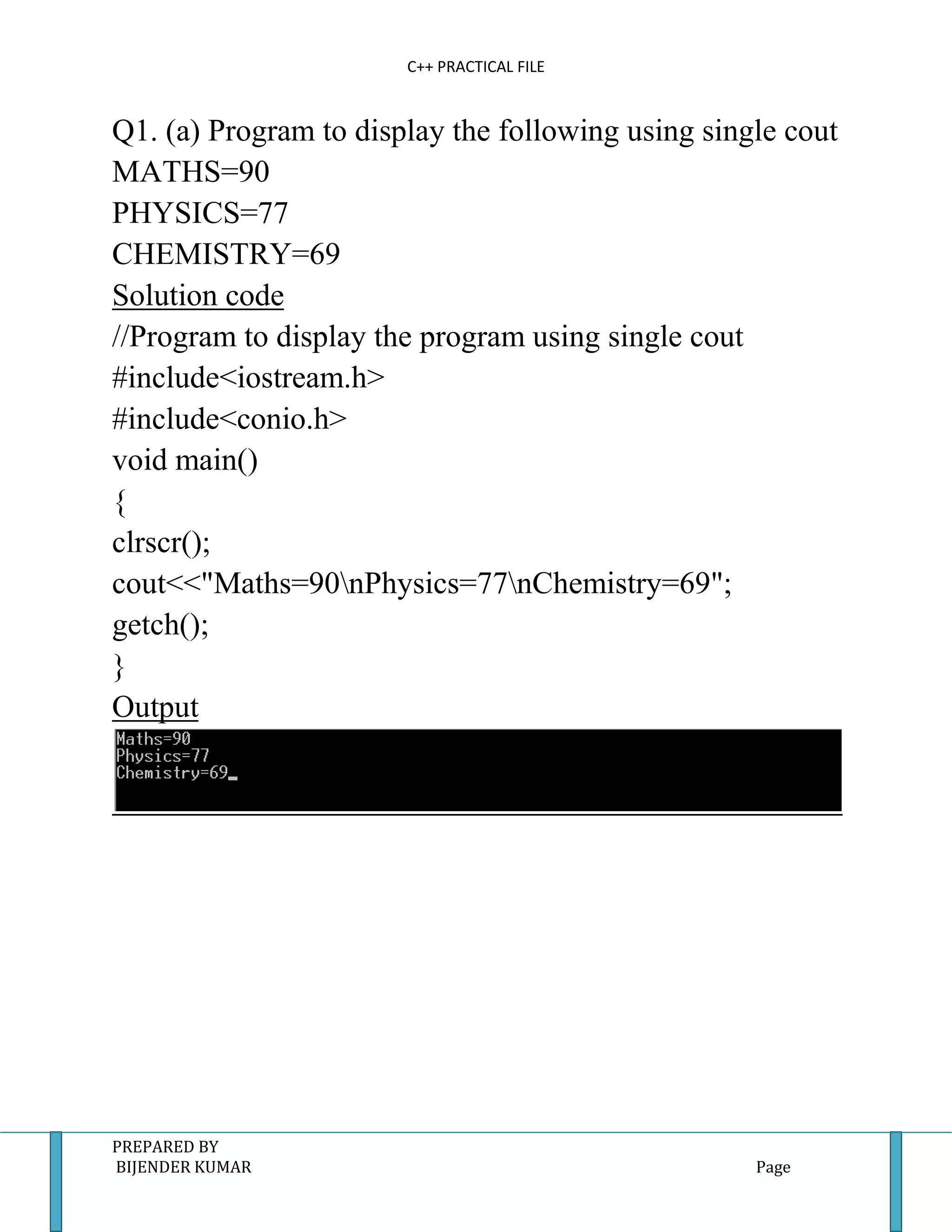 This document contains solutions to 26 questions on C++ programming. It includes programs to display text using single and multiple cout statements, programs to check if a year is a leap year, solve quadratic equations, check if a number is even or odd, perform arithmetic operations using switch case, display the first 10 natural numbers and their sum, Fibonacci series, factorial of a number, check if a number is prime, find the sum of series, generate patterns with characters and numbers, find the sum and average of array elements, perform linear search on an array, and find the maximum number in an array. The document is prepared by Bijender Kumar and contains the question solutions and output for each program.