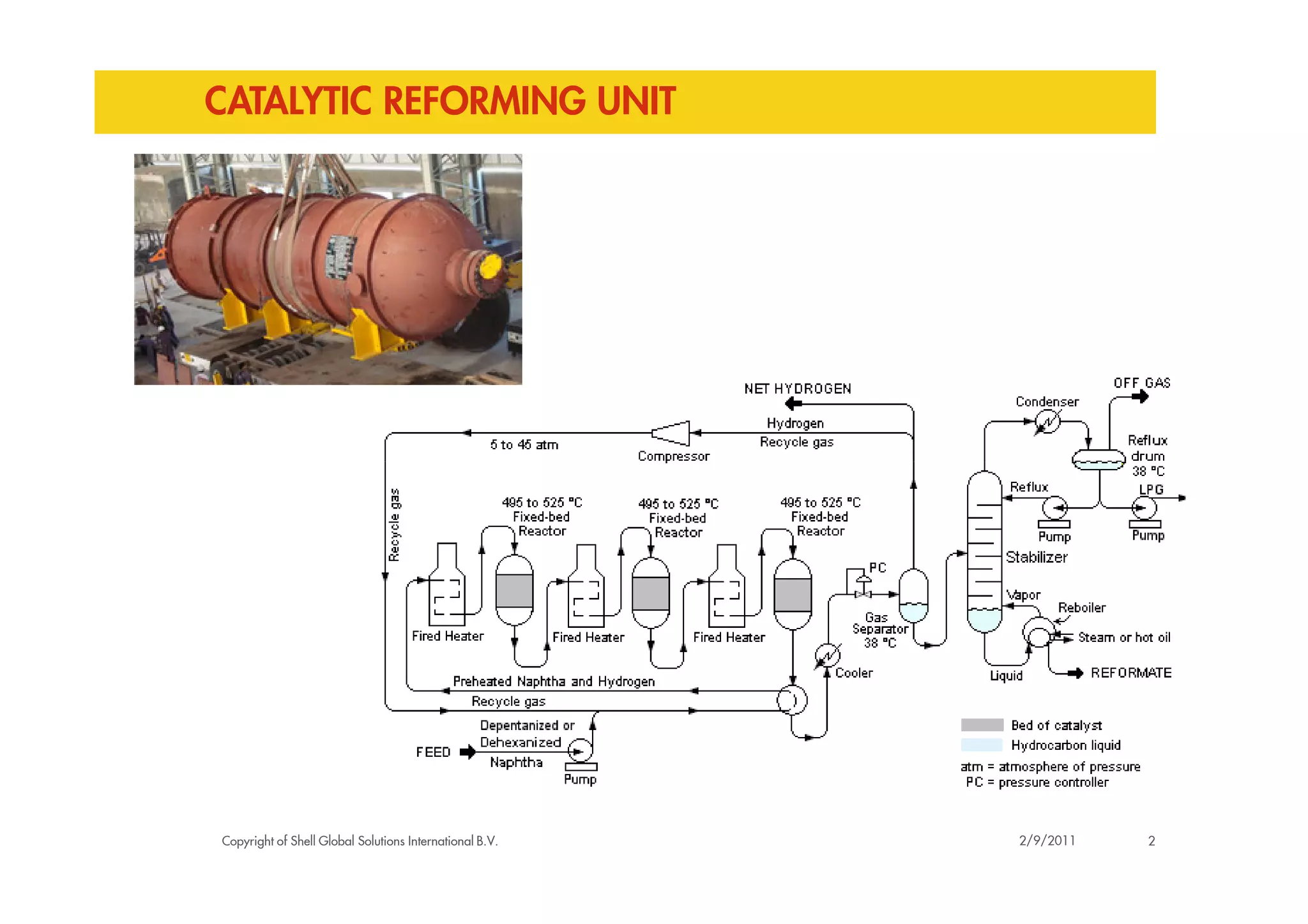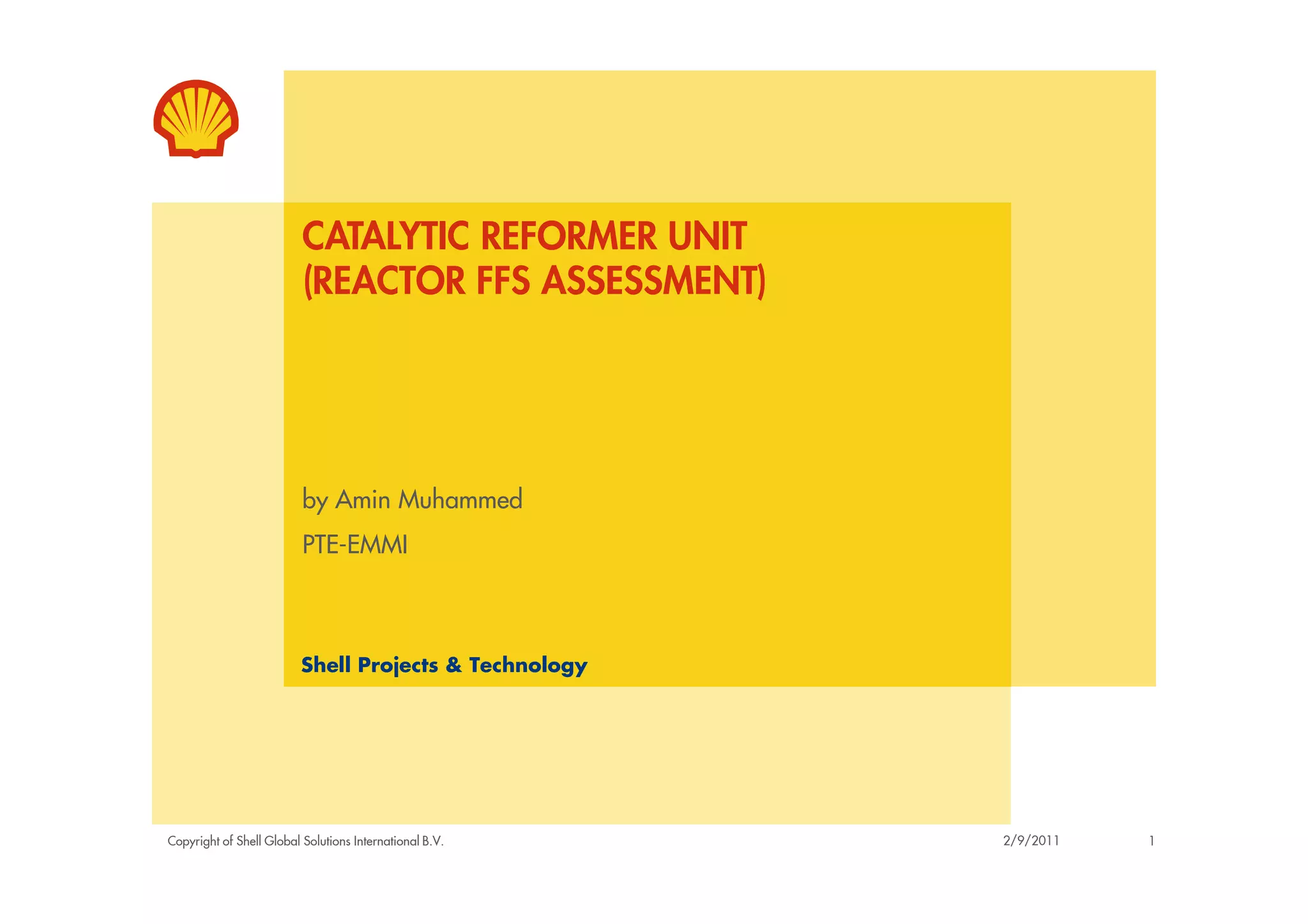 The document discusses a creep damage assessment of the Reactor F105 vessel in a catalytic reforming unit. It provides background on the unit's commissioning in 1971 and history of reported damage since 1999. A stress analysis using FEA found stresses were approximately 50MPa compared to 68MPa using a flat plate solution. While rupture life is predicted to be consumed, remaining creep life depends on the integrity of the remaining wall after grinding. Based on available data, remaining life is estimated to be 50% with an inspection interval of 2 years recommended to understand long term degradation.