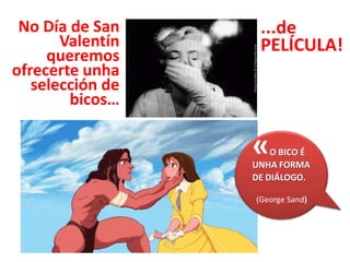 Fotogramas con bicos destacados da historia do cine para celebrar o 14F, o Día de San Valentín. Presentación power point elaborada por membros da Biblioteca "Sarturnino Hermida" do IES "Concepción Arenal" de Ferrol.