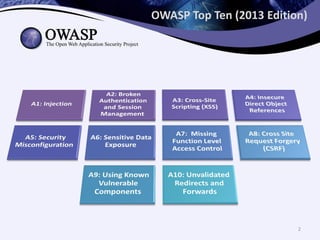 The 2013 OWASP Top Ten document outlines the most critical web application security risks, including issues like injection flaws, broken authentication, and cross-site scripting. It details the vulnerabilities, typical attack patterns, and provides recommendations for avoiding these security risks. The document emphasizes the importance of secure coding practices, proper session management, and regular updates to components to mitigate potential threats.