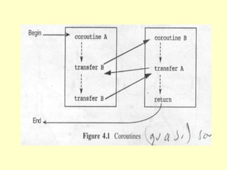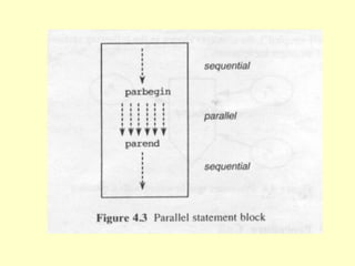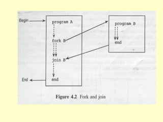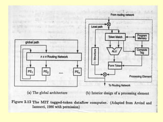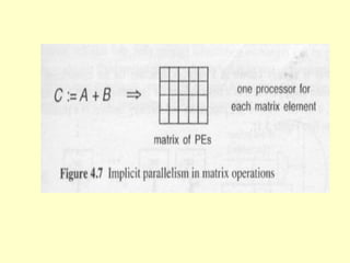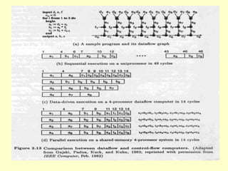 This chapter discusses different concepts for parallel processing including control flow, data flow, and demand driven approaches. Control flow is based on sequential execution guided by a program counter, while data flow and demand driven approaches allow for more parallelism driven by data or demand availability. Data flow architectures emphasize fine-grained parallelism at the instruction level without shared memory. Demand driven approaches initiate operations based on demand for results. The chapter compares different flow mechanisms and discusses concepts like coroutines, fork/join, and remote procedure calls for parallel programming.