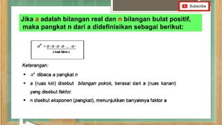Dokumen ini menjelaskan definisi bilangan berpangkat dengan a sebagai bilangan real dan n sebagai bilangan bulat positif. Terdapat juga pembahasan sifat-sifat bilangan berpangkat dan beberapa contoh soal yang harus dihitung dan disederhanakan. Dokumen ini mencakup sepuluh soal untuk latihan.