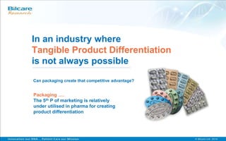 Packaging can help create competitive advantage and product differentiation in industries where tangible differences are difficult. Bilcare provides innovative packaging solutions to help pharmaceutical brands address challenges like compliance, communication, convenience, and counterfeiting. Their solutions include child-resistant and compliance-enhancing packaging, as well as designs that build brand associations and identities. Bilcare's innovative approaches help improve medication adherence and safety while strengthening brands.