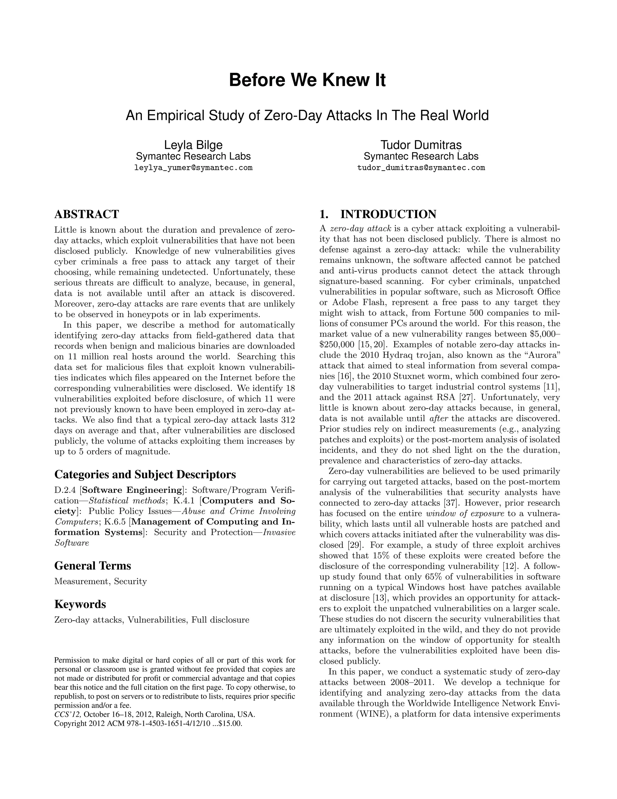 The document describes an empirical study that identifies zero-day attacks from data on 11 million real-world hosts. The study finds 18 vulnerabilities exploited before public disclosure, with 11 being previously unknown zero-day attacks. On average, a zero-day attack lasts 312 days and affects few hosts, though some high-profile attacks like Stuxnet spread more widely. After disclosure, the number of malware variants and attacks increase by up to 5 orders of magnitude as cyber criminals start exploiting the now public vulnerabilities on a larger scale before patching occurs.