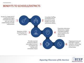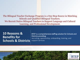The Bilingual Teacher Exchange Program (BTEP) connects schools with qualified bilingual teachers, offering comprehensive staffing solutions including recruitment, training, and support services. Benefits include a high retention rate of teachers, immediate staffing solutions, and ongoing professional development. The program aims to enhance language and cultural learning for students and families, while delivering effective classroom instruction by motivated educators.