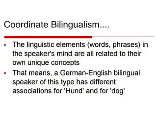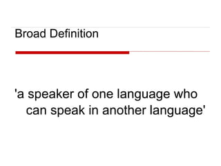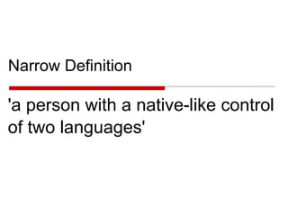 Bilingualism refers to using two languages fluently like a native speaker. There are different types of bilingualism including additive bilingualism which occurs when a second language is learned in addition to the first, and subtractive bilingualism where the first language is replaced by the second. Early bilingualism can be simultaneous, where two languages are learned from birth, or successive where a second language is learned after partially acquiring the first language in early childhood. Late bilingualism refers to learning a second language after age 6 or 7, especially in adolescence or adulthood. Passive bilingualism means understanding a second language without speaking it. Learning a second language provides cognitive benefits for children and promotes empathy, cultural understanding,