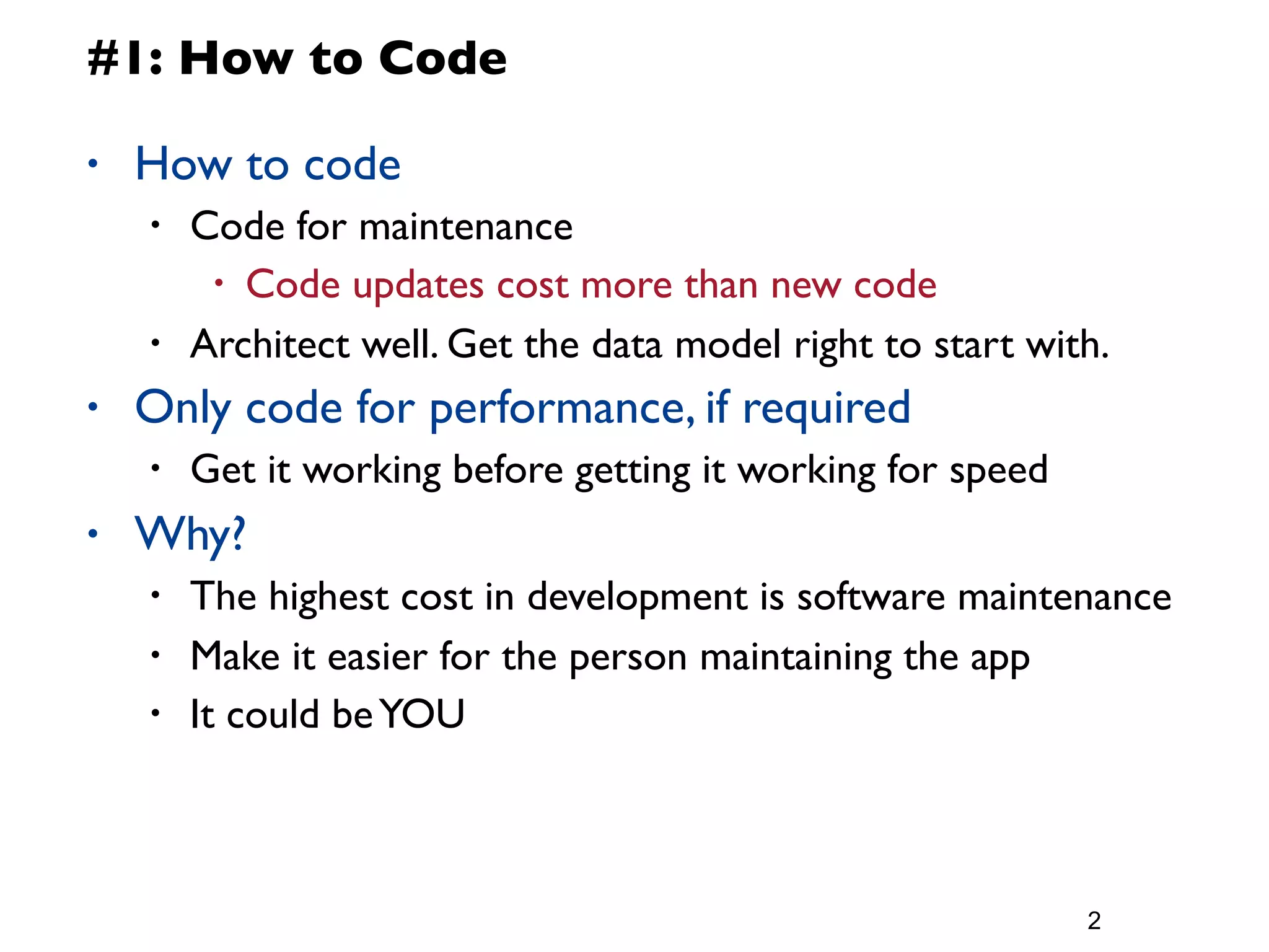 The document provides a 12 step guide to writing efficient and maintainable LotusScript code. The steps include how to code with a focus on maintenance, testing early and often, planning before coding with the "measure twice, cut once" approach, using defensive coding practices, leveraging built-in data types like NotesDateTime instead of strings, and using functions like Evaluate and GetThreadInfo to get runtime information. Logging is also recommended for applications with scheduled agents or a diverse user base. The overall emphasis is on writing code that is well-structured, tested, and optimized for long-term maintenance and support.