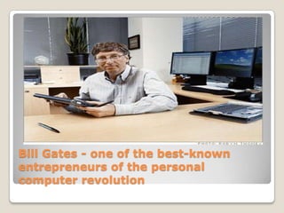 Bill Gates is one of the most well-known entrepreneurs of the personal computer revolution. He began programming at age 13 and co-founded Microsoft Corporation. Gates built his dream of starting Microsoft, which became famous for its computer operating systems like MS-DOS. While Gates has been criticized for some anti-competitive business tactics, he is now focused on philanthropy through the Bill & Melinda Gates Foundation to help people worldwide in areas of global health and learning.