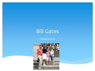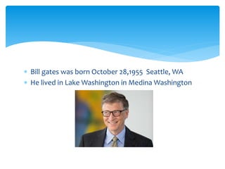 Bill Gates was born in 1955 in Seattle, Washington. He created the software company Microsoft and served as its CEO. Gates has three sisters and three children with his wife Melinda French Gates. He attended Harvard University and Lakeside School, studying computer science.