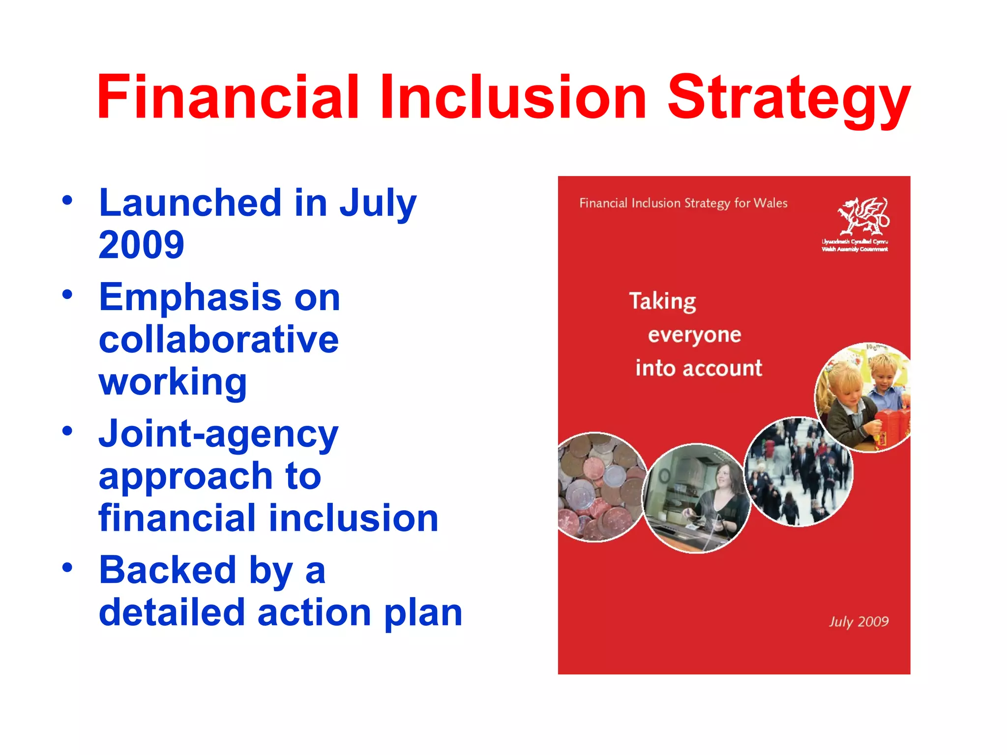 The Financial Inclusion Strategy for Wales aims to improve access to financial services and education through collaborative efforts. It identifies five strategic themes: access to banking and affordable credit, access to debt and financial advice, improving financial literacy, and maximizing income through claiming eligible benefits. The strategy recognizes that financially excluded individuals often live in social housing and aims to engage housing providers to help residents access services like banking, credit unions, money advice, and education programs to improve their financial capability. Significant contributions to advance financial inclusion in Wales include establishing teams to promote inclusion, developing education programs in schools, and securing funding to support credit unions and combat predatory lending.