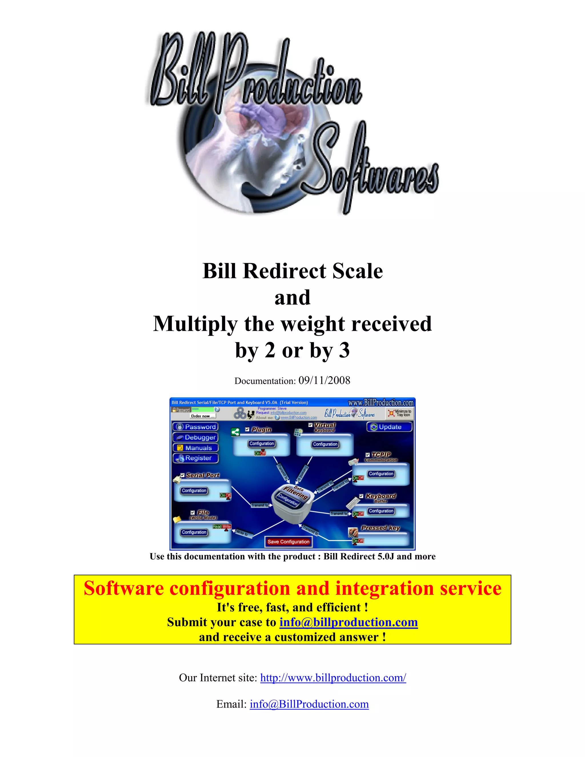 This document provides instructions for configuring Bill Redirect software to integrate a scale and multiply weight readings by 2 or 3. The 9 step process includes downloading and installing the software, configuring the serial port and virtual keyboard buttons to multiply weights, and saving the configuration. Additional resources are provided for support and the product manual.