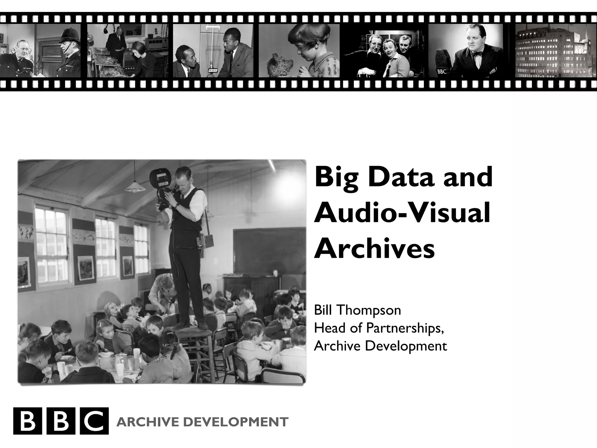 Big data and audio-visual archives present opportunities and challenges for archive development. Bill Thompson, Head of Partnerships at an archive, discusses how the rise of big data requires archives to develop new strategies and technologies to manage larger collections of audio-visual materials and ensure continued access to content. Thompson also notes the importance of partnerships to help archives address these new demands through shared knowledge and resources.