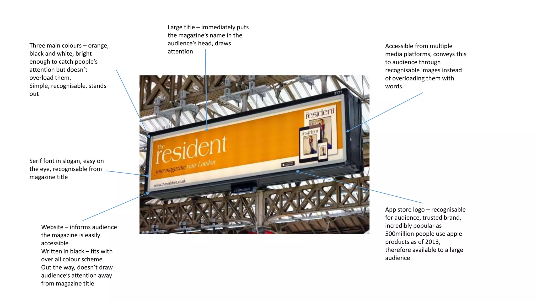 The document describes the design elements of a magazine advertisement, including its use of three main colors (orange, black, and white) that catch attention without overwhelming viewers. It also notes the serif font is easy to read and recognizable from the magazine title, while images on the website and app store logo make the magazine accessible on multiple platforms. The large title immediately gets the magazine's name in viewers' heads.
