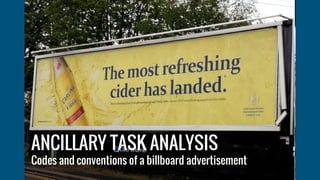 This billboard advertisement for Carling beer uses bright colors, large images, and simple fonts to attract viewers' attention. The logo, bottle image, and slogan directly relate to promote the message that the beer provides a refreshing drink. The conventions aim to make viewers want to drink the product by conveying feelings of relaxation and refreshment. Specifically, the slogan claims it is the "most refreshing" option compared to competitors, while the splash image signifies being cooled down and thirst being quenched, further persuading people to want the drink.