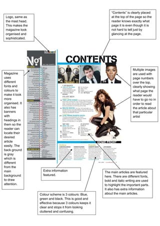 The magazine uses various design elements like logos, fonts, colors, images, and banners to make the content easy for readers to navigate and locate desired articles. Key information is highlighted through bolding and italics. The layout employs a color scheme of blue, green and black to look organized without appearing cluttered. Page numbers are clearly displayed above images so readers know which page to turn to for a particular article.