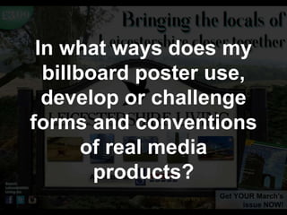 This document discusses conventions used in billboard advertising and how the author's billboard poster for a regional magazine both follows and challenges some conventions. It follows conventions by using an eye-catching focal image, bold colors and fonts, and including ordering/location information. However, it challenges conventions by not being minimalistic like typical urban billboards and by advertising a magazine for a rural audience in an urban setting, where the target audience would be mismatched. The document provides analysis of how different audiences might interact with the billboard and magazine based on concepts like two-step flow of communication and Maslow's hierarchy of needs.