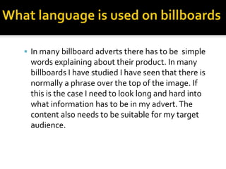 Successful billboard advertisements typically include a short, simple phrase at the top to grab attention, with the main image and logo providing most of the context about the product or service being advertised. While words are minimized, the image aims to convey the core message in an engaging way that makes viewers want to learn more. Fine print with legal terms is also commonly included but kept relatively small and less prominent.