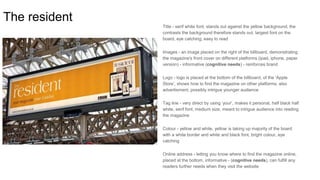 The document summarizes several billboard advertisements for magazines. It analyzes elements like the title, images, logos, taglines, colors, and addresses used in the billboards. Common conventions highlighted are using minimal text, large eye-catching images, websites for additional information, bold serif fonts, and bright colors to catch attention as people pass by. The billboards analyzed promote magazines like Apple Store, ELLE, Vogue, and Three One Three and aim to intrigue viewers to read the magazines.