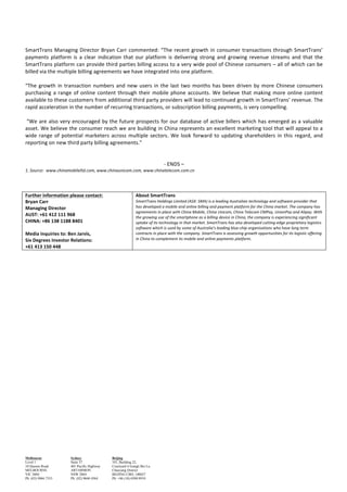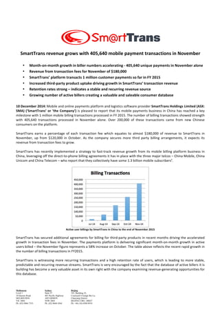 SmartTrans saw strong growth in its mobile payment transactions in November, processing 405,640 unique payments and generating $180,000 in revenue from transaction fees. Its platform has now processed over 1 million customer payments in the fiscal year. Increased uptake of its third-party billing arrangements is driving further transaction and revenue growth. The company is building a valuable database of active billers and customers in China.