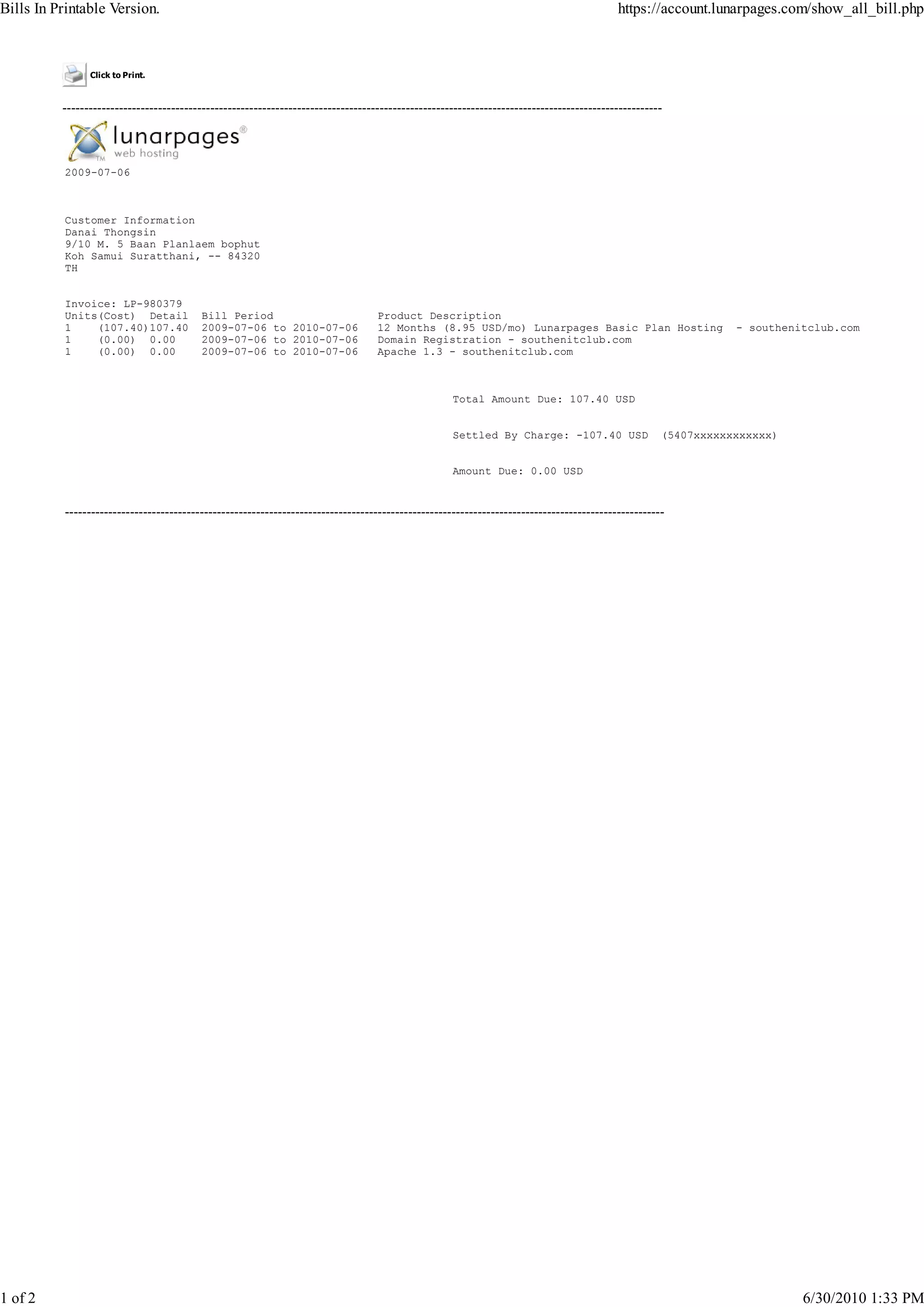 This document contains two invoices from Lunarpages for web hosting services provided to Danai Thongsin for the domain southenitclub.com. The first invoice from 2009 details 12 months of basic hosting for $107.40 and includes domain registration and Apache server hosting at no additional cost. The second invoice from 2010 charges $107.40 for an additional 12 months of basic hosting and $19.95 for domain registration renewal, totaling $127.35 due. Both invoices note the amounts were settled by credit card with a zero balance remaining.