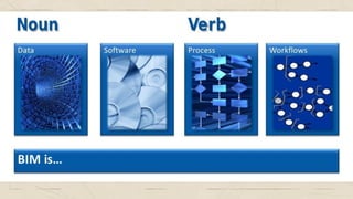 The document discusses Building Information Management (BIM) and provides information on: