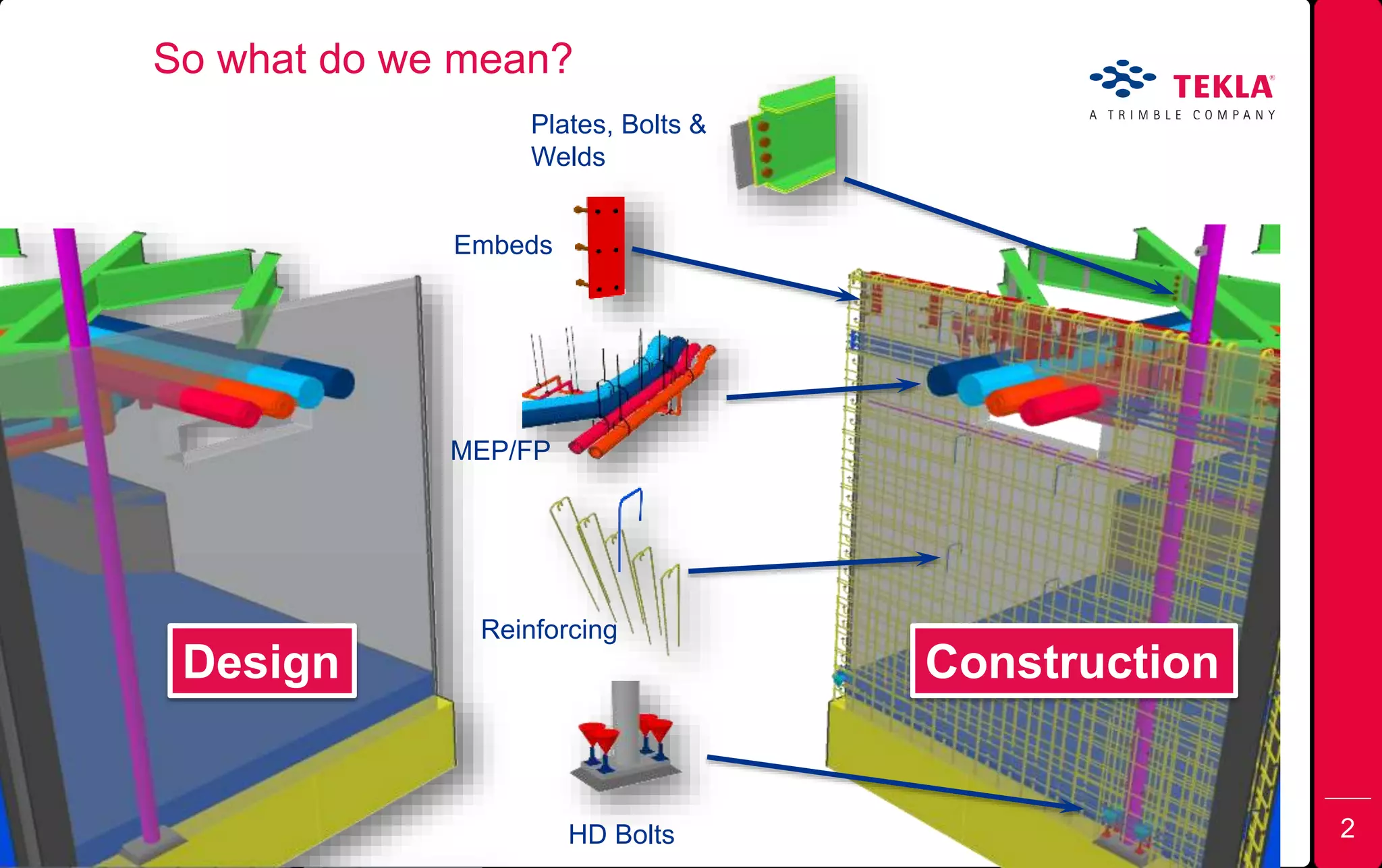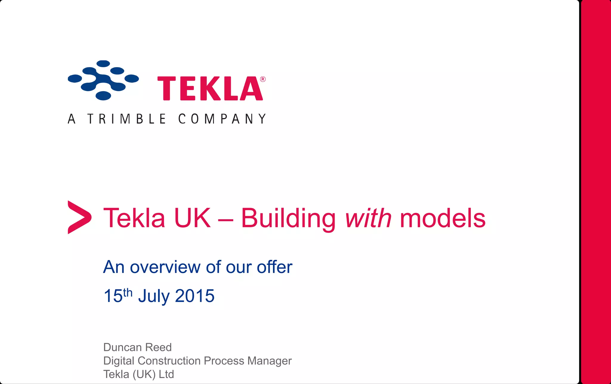 The document outlines Tekla's offerings for building information modeling (BIM), emphasizing their software solutions for structural design, analysis, and construction management. It details various tools, including Tekla Structures for modeling, Tekla Campus for education, and Tekla Bimsight for project collaboration. Additionally, it highlights the interoperability of their platforms to enhance communication and data sharing within the construction process.