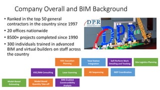 This document presents a case study on the use of building information modeling (BIM) on the UCSF Medical Center project in San Francisco, California. It discusses how BIM was used throughout planning, design, and construction, resulting in cost savings of over $100 million. Key aspects of the BIM implementation included co-locating over 100 project stakeholders in an integrated workspace, establishing cluster teams to enhance collaboration, and using BIM for coordination, quantity take-offs, scheduling, and facility management. The extensive use of BIM on this large, complex project helped reduce costs, improve schedule reliability, and increase productivity during construction.
