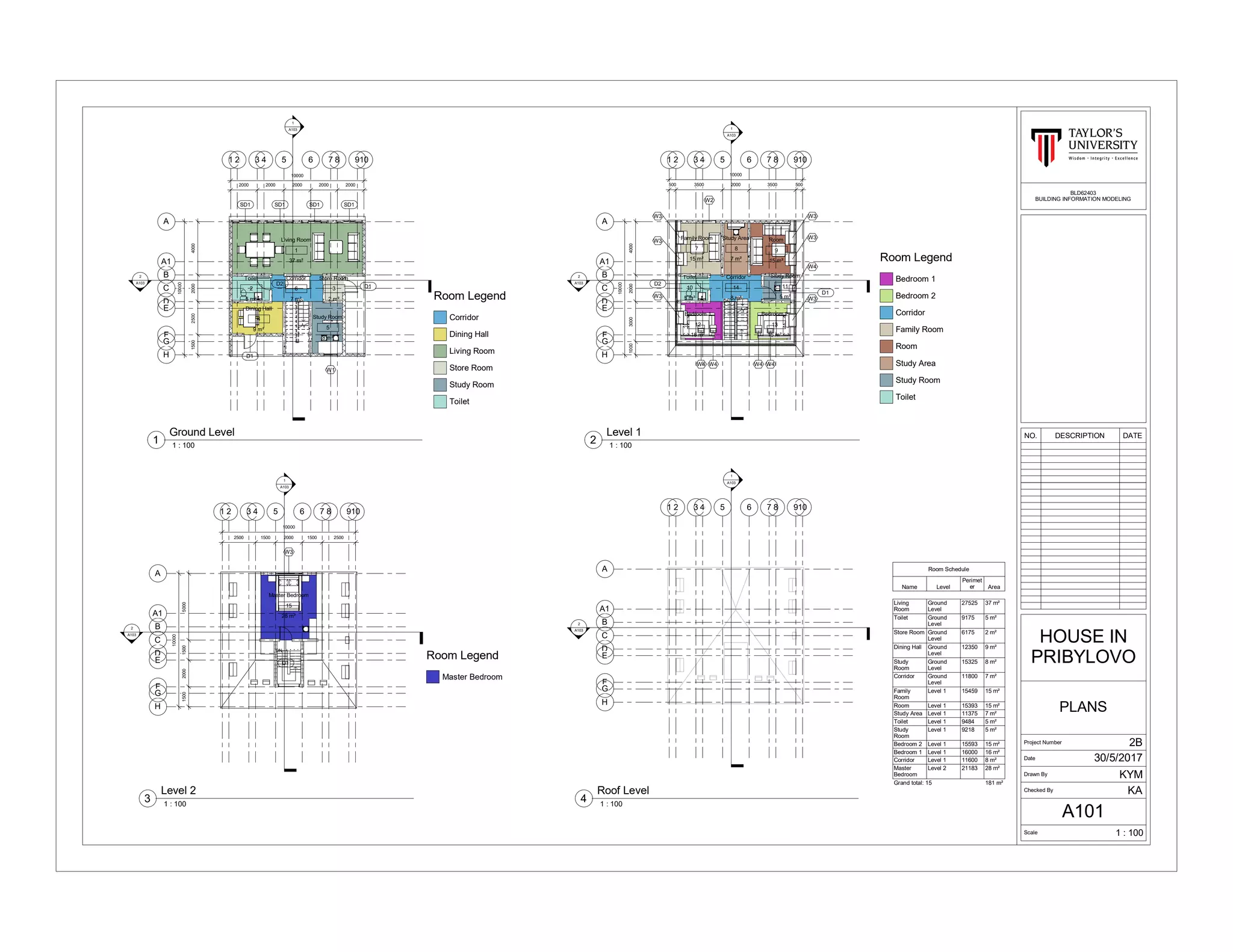 This document contains building plans and design specifications for a house in Pribylovo including floor plans, elevations, sections, an exploded isometric view, and interior/exterior perspectives. The floor plans show room layouts and dimensions for the ground level, level 1, and level 2. Elevations depict the design of the north, south, east, and west facades. Additional pages include a room schedule, phase floor plan, and 3D renderings.