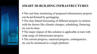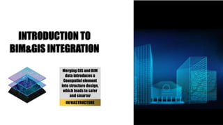 This document discusses integrating building information modeling (BIM) and geographic information system (GIS) data. It explains that merging BIM and GIS data introduces geospatial elements into infrastructure design, allowing for safer and smarter infrastructure projects. The document outlines the workflow for importing a Revit file as a 3D model into ArcGIS Pro, geotagging the model, exporting elements as feature classes, and creating a web scene to analyze the model. Integrating BIM and GIS provides a robust context model where infrastructure design and geographic data are combined for better understanding assets.