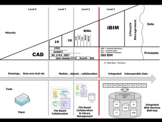The document discusses Building Information Modeling (BIM) in the context of the UK architecture and construction industry, focusing on its increasing importance due to advancements in technology and governmental mandates for energy efficiency. It outlines the benefits of BIM, including cost reduction and improved performance, as well as the challenges and necessary training for successful implementation. Additionally, it shares insights from a pilot project, highlighting gains in productivity and the evolution of the team's understanding and use of BIM through various stages.