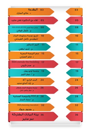 تتناول الوثيقة موضوع نمذجة معلومات البناء (BIM) وأهميتها في تحسين فعالية وابتكار طرق الإدارة في مشاريع البناء. تبرز الفوائد المترتبة على استخدام هذه التكنولوجيا في تقليل التكاليف وزيادة الكفاءة وتسهيل التعاون بين مختلف الأطراف المعنية. كما تناقش الوثيقة التحديات التي تواجه تطبيق هذه التكنولوجيا وكيف يمكن التغلب عليها.