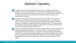 The document discusses the concept of bimodal IT and the need for organizations to adopt both traditional ("Mode 1") and more agile ("Mode 2") approaches to software delivery. It provides context around the increasing digital demands on organizations and the limitations of conventional IT methods. The document then defines bimodal IT and contrasts the characteristics of Mode 1 versus Mode 2. It also discusses some of the challenges to adopting more agile approaches and outlines a proposed roadmap for organizations to evolve towards a bimodal model of IT.