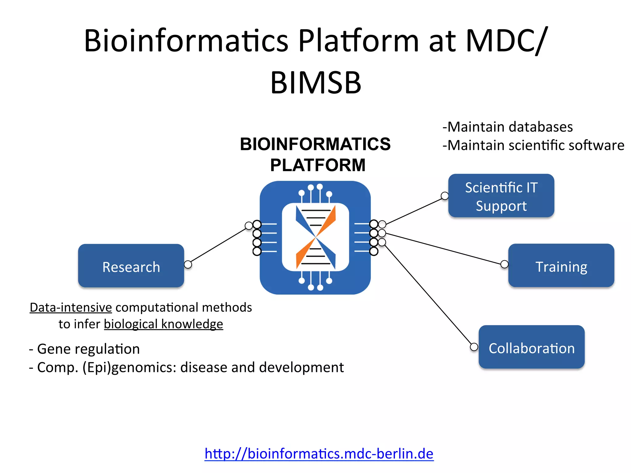 This document summarizes the Bioinformatics Platform at the Max Delbruck Center for Molecular Medicine in Berlin-Buch. The platform provides data analysis and computational resources to support genomic and epigenomic research. Services include maintaining databases and scientific software, providing scientific IT support, training courses, and collaborating with researchers on data analysis projects. Walk-in consultations are also offered monthly to help with bioinformatics problems.