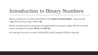 •Binary numbers are numbers represented in the base-2 numeral system, using only two