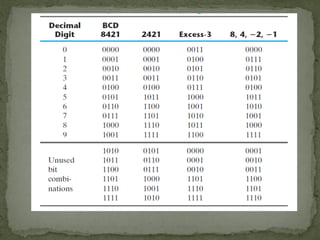 - Binary coded decimal (BCD) which assigns a weight to each digit position to represent decimal numbers. Other positively weighted codes and negatively weighted codes are also discussed.