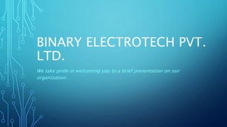 Binary Electrotech Pvt. Ltd. is an Indian company established in 2010 as part of the Binary Group with a vision to provide leadership in audio-visual, imaging, and security solutions. The company offers customized technical products, solutions, and services targeting various industries. It has expanded rapidly since inception and successfully executed projects in both public and private sectors. The Binary Group has over 25 years of experience and multiple companies providing solutions for power electronics, springs, food, and more.