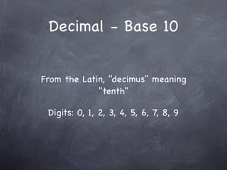 The document discusses different number bases: decimal, binary, and hexadecimal. It defines what each base means and lists their digits. For binary, it gives an example of adding two binary numbers by carrying digits to the next column like decimal. It also includes a table that lists binary, decimal, and hexadecimal numbers and their values.