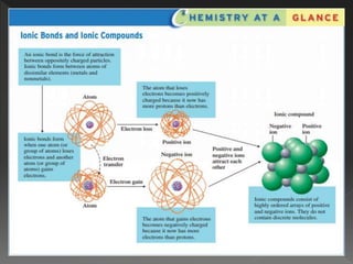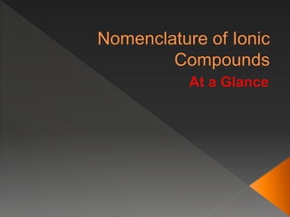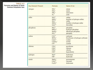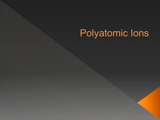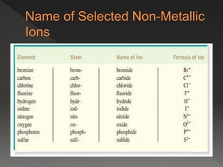 This document provides information on binary compounds and ionic compounds containing polyatomic ions. It defines binary compounds as those containing only two elements and ionic binary compounds as those where one element is a metal and the other is a non-metal. Rules are provided for naming ionic compounds containing metals and non-metals or polyatomic ions. Key points include that polyatomic ions are charged groups that don't occur alone and ionic compounds contain positive and negative ions to be neutral overall. Formulas show how to write names and formulas for ionic compounds containing polyatomic ions.